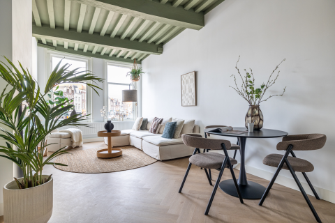 *de sfeervolle woonkamer heeft een balkenplafond en laminaat op de vloer met vloerverwarming.