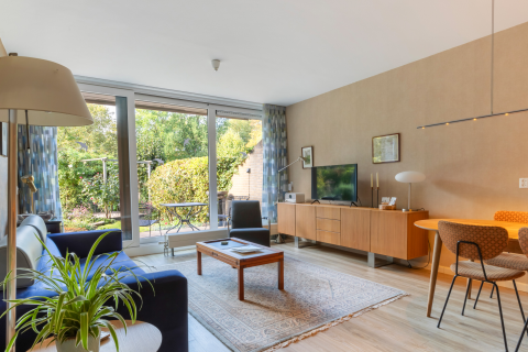 Souterrain: heel fijne, gezellige woonkamer met brede serre met geweldig uitzicht op de tuin, die via de openslaande deuren bereikbaar is. Open keuken (crème hoogglans) met kunststof aanrechtblad, rvs spoelbak, gaskookplaat, afzuigkap, combi-oven, vaatwasser en een koel-/vriescombinatie. Portaal met toilet (hangend) + fontein en berg-/was-/cv-ruimte.